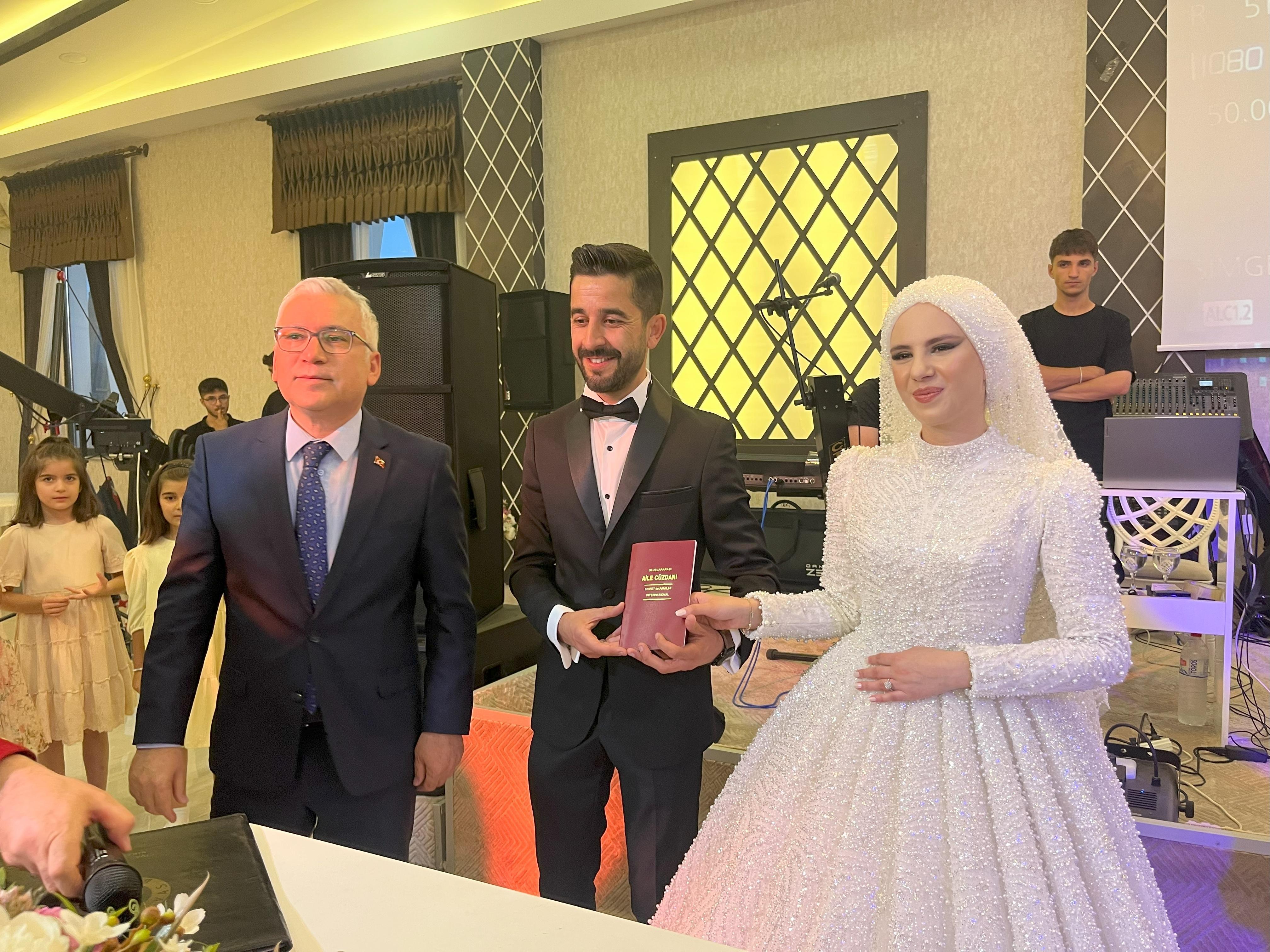 Vali Şimşek, nikah sonrası evlilik cüzdanını çifte teslim etti. Şimşek, yaptığı açıklamada, “Genç çiftimize ömür boyu mutluluklar diliyorum. Hayat boyu sürecek bir sevgi, saygı ve huzur içinde bir ömür temenni ediyorum" dedi. (DHA)