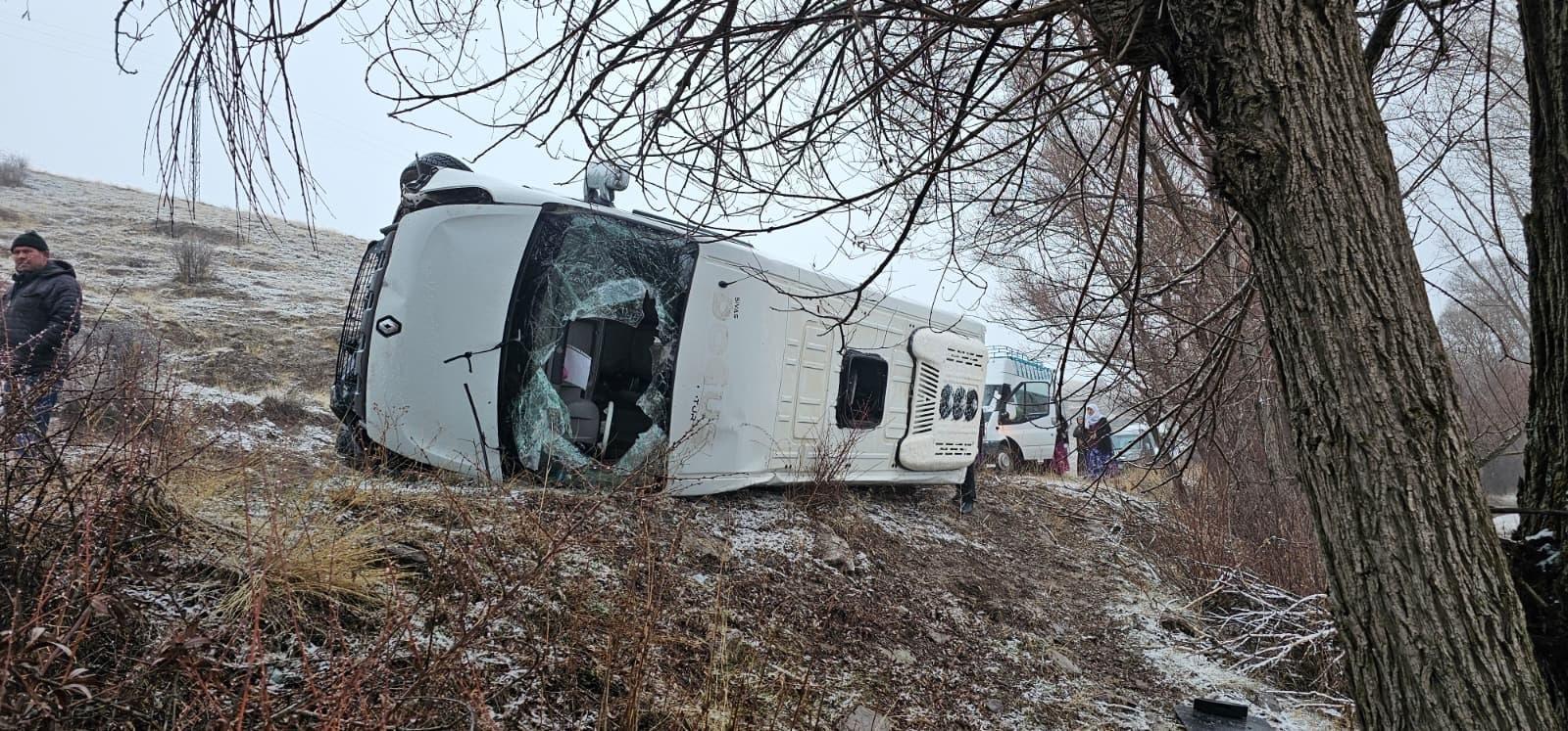 Kaza, saat 07.30 sıralarında merkeze bağlı Alahacı köyü yakınlarında meydana geldi. Köyden Yıldız beldesi İsmet Yılmaz Çok Programlı Anadolu Lisesi'ne öğrenci taşıyan, sürücüsü henüz öğrenilemeyen 58 AGV 495 plakalı öğrenci servis minibüsü, yoldaki buzlanma nedeniyle kontrolden çıkıp, yan yatarak devrildi. Kazada şoför ile birlikte 14 öğrenci hafif yaralandı. İhbarla bölgeye sağlık, AFAD ve jandarma ekipleri sevk edildi. Yaralılar, ambulanslarla kentteki çeşitli hastanelere kaldırıldı. Yaralıların durumunun iyi olduğu öğrenildi. Kazayla ilgili soruşturma başlatıldı. (DHA)