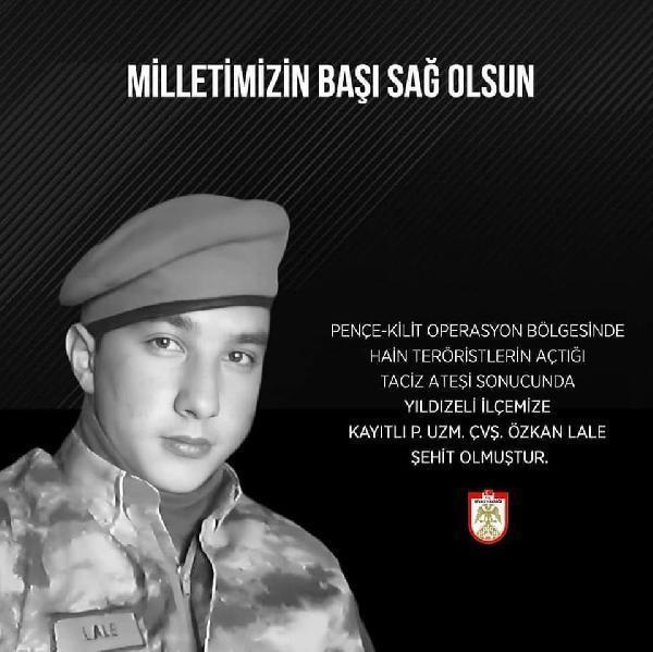Sivas'ın Yıldızeli ilçesi nüfusuna kayıtlı Piyade Uzman Çavuş Özkan Lale, görev yaptığı Pençe Kilit Harekatı bölgesinde teröristlerin uzun namlu silahlarla açtığı taciz ateşi sonucu şehit düştü. Şehit haberini Sivas Valiliği sosyal medya hesabından duyurdu. Acılı haber şehidin Yıldızeli ilçesinde yaşayan ailesine iletildi. Şehidin baba ocağına Türk bayrakları asılırken, yakınları taziye ziyaretine geldi. Şehidin cenazesinin Yıldızeli ilçesinde toprağa verileceği öğrenildi. (DHA)
