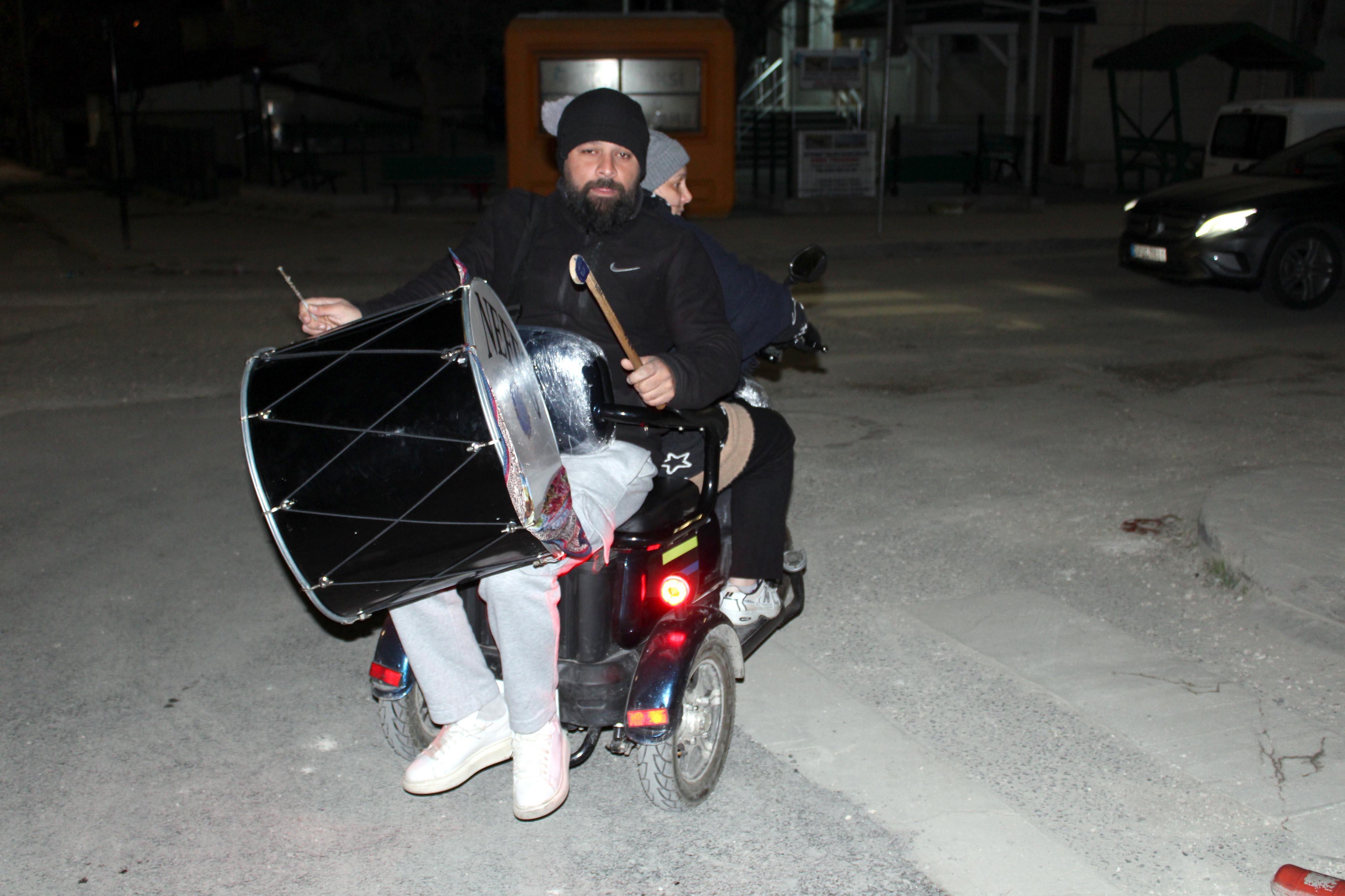 Onur KAYA/ÇERKEZKÖY (Tekirdağ), (DHA)- TEKİRDAĞ’ın Çerkezköy ilçesinde Erhan Halka (31), 7 aylık hamile eşi Sevgi Halka’nın (29) kullandığı elektrikli motosiklete ters binip davul çalarak mahalleliyi sahura kaldırıyor. Halka, "Ben davul çalıyorum, eşim de motosikleti kullanıyor. Böylece motorize ekip gibi çalışıyoruz. Zamandan tasarruf ederek halkımıza daha iyi hizmet vermeye çalışıyoruz. Her sokağa girip vatandaşlarımızı sahura kaldırıyoruz” dedi.