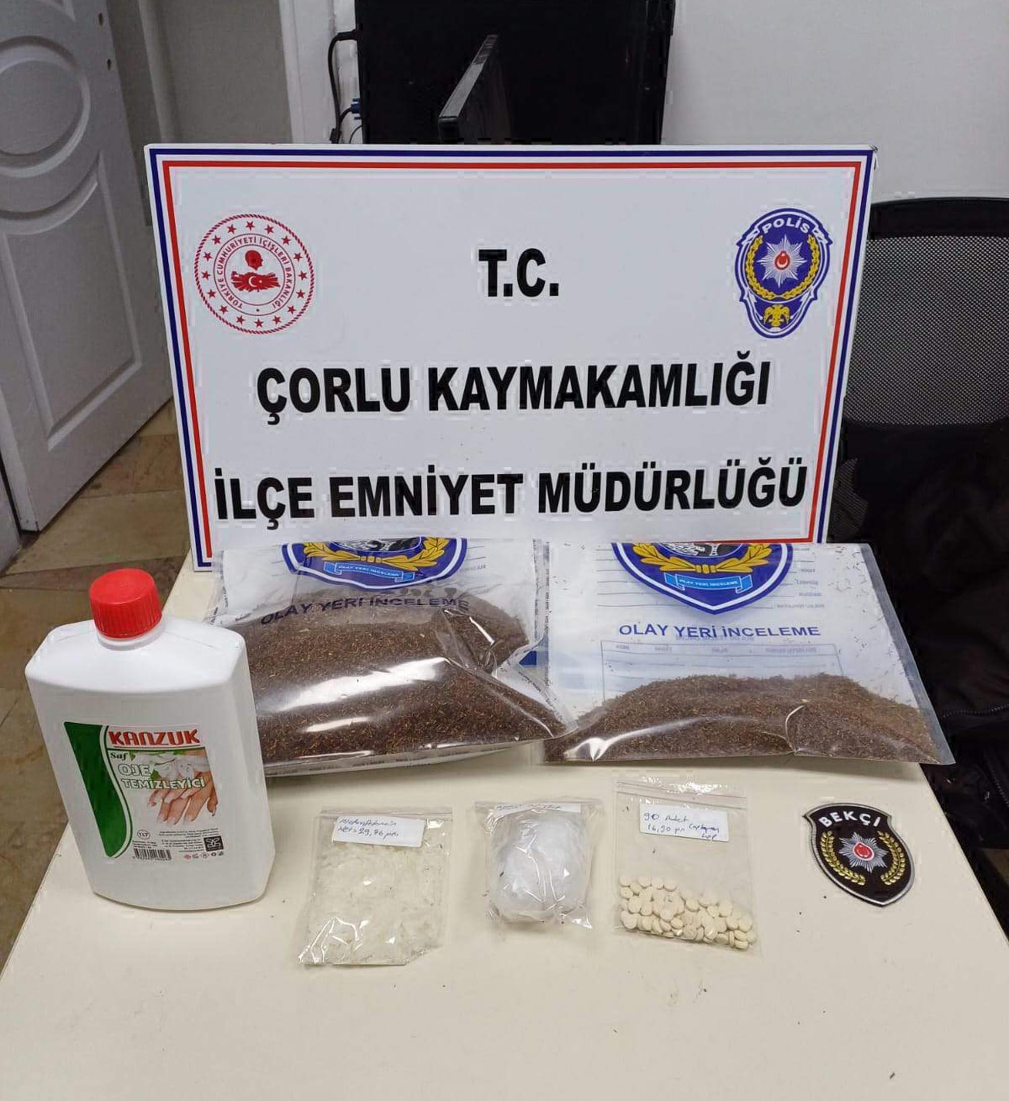Çorlu'nun Cemaliye Mahallesi Salih Omurtak Caddesi üzerindeki Tahtalı Cami mevkisinde devriye görevi yürüten bekçiler, hareketlerinden şüphelendikleri Ö.A.'yu durdurup üzerinde arama yaptı. Aramada, Ö.A.'nın bel çantasında 534,95 gram bonzai, 30,34 gram metamfetamin, 90 uyuşturucu hap ve 1 adet hassas terazi ele geçirildi. Gözaltına alınan Ö.A., emniyetteki işlemlerinin ardından sevk edildiği adliyede çıkarıldığı mahkemede tutuklandı. (DHA)