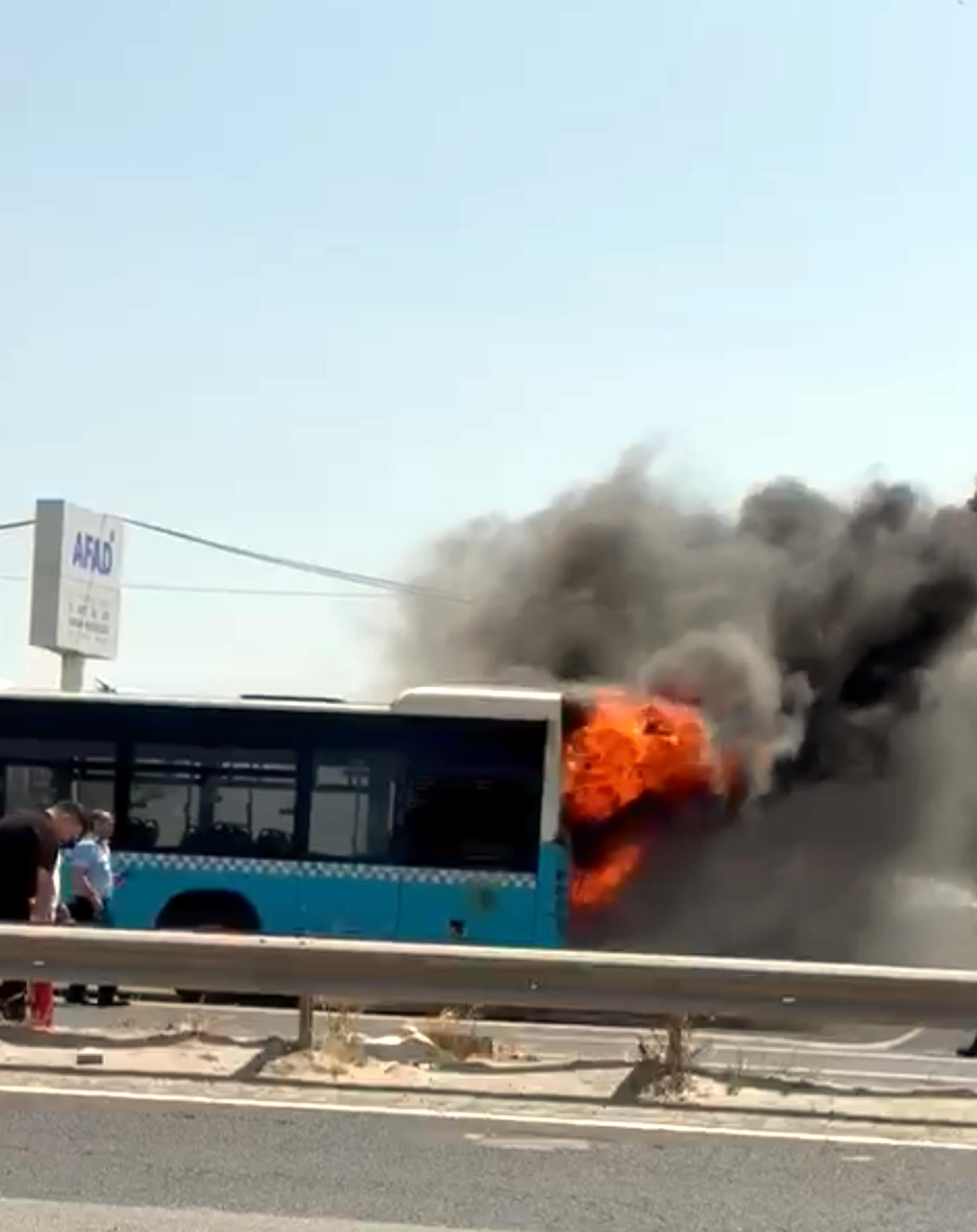 Tekirdağ Büyükşehir Belediyesi'ne ait, Servet S.'nin kullandığı 59 DM 914 plakalı otobüs, Çorlu-İstanbul kara yolu yüksekokul mevkisinde motor kısmından alev aldı. Şoför, otobüsü kenara çekip kapılarını açarak, yolcuları indirdi. Otobüs, şoförün ihbarıyla bölgeye sevk edildi. O sırada bölgede çiçekleri sulayan Çorlu Belediyesi Park ve Bahçeler Müdürlüğü'ne ait araç, yangına müdahale eti. İtfaiye ekipleri de otobüste inceleme yaparken, yangına dair inceleme sürüyor. (DHA)