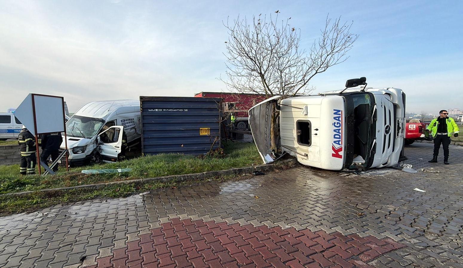 Mehmet YİRUN-Mehmetcan ARSLAN/ERGENE (Tekirdağ), (DHA)- TEKİRDAĞ’ın Ergene ilçesinde, sürücüsünün kontrolünü yitirdiği TIR, refüjü aşıp karşı yöne geçerek minibüse çarptı. TIR ve minibüsün devrildiği kazada, 1’i çocuk, 5 kişi yaralandı.