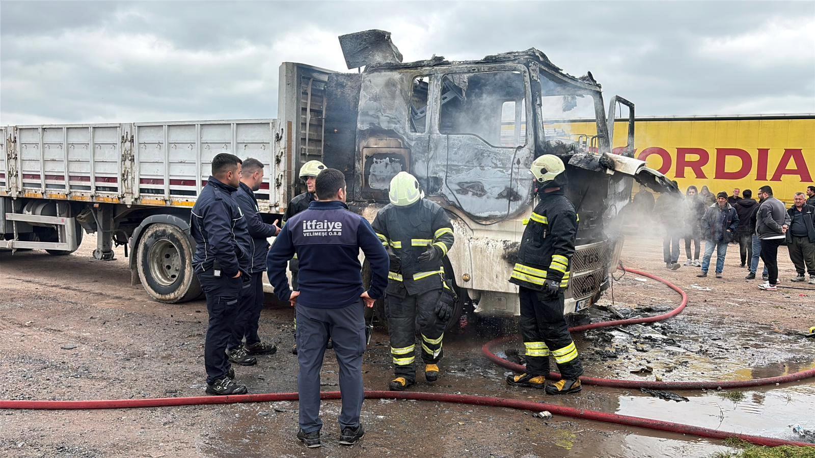 Yangında TIR kullanılamaz hale gelirken, inceleme başlatıldı. (DHA)