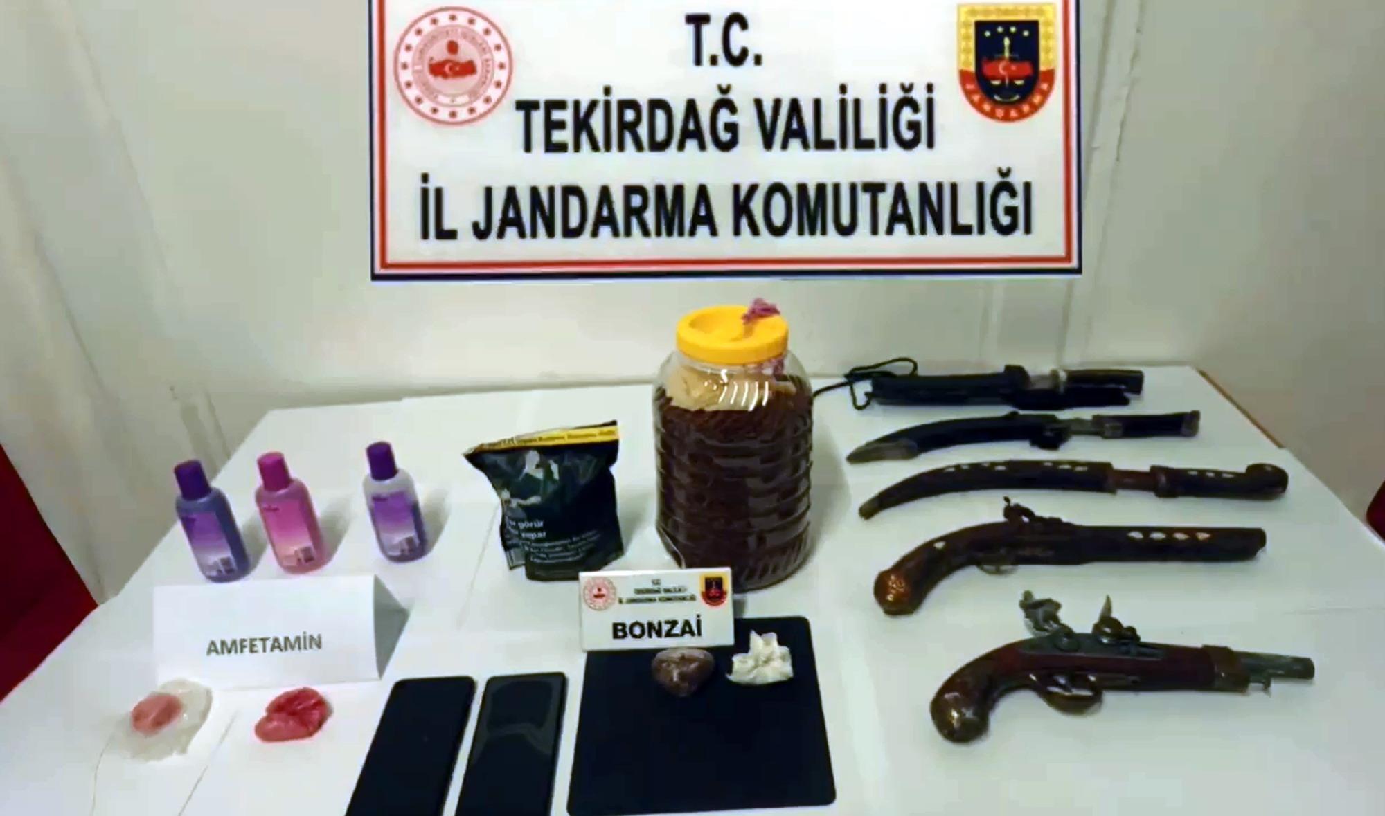 İl Jandarma ve Şarköy İlçe Jandarma Komutanlığı ekipleri, uyuşturucuyla mücadele kapsamında Mürefte Mahallesi’nde F.B. ve M.B.’ye ait 4 ayrı evinde arama yaptı. Aramalarda, 2 kilo 870 gram bonzai, 375 mililitre bonzai yapımında kullanılan sıvı madde, 35 gram bonzai yapımında kullanılan katı madde, tarihi eser olduğu değerlendirilen 2 silah, 3 adet kama ve 2 adet cep telefonu ele geçirildi.