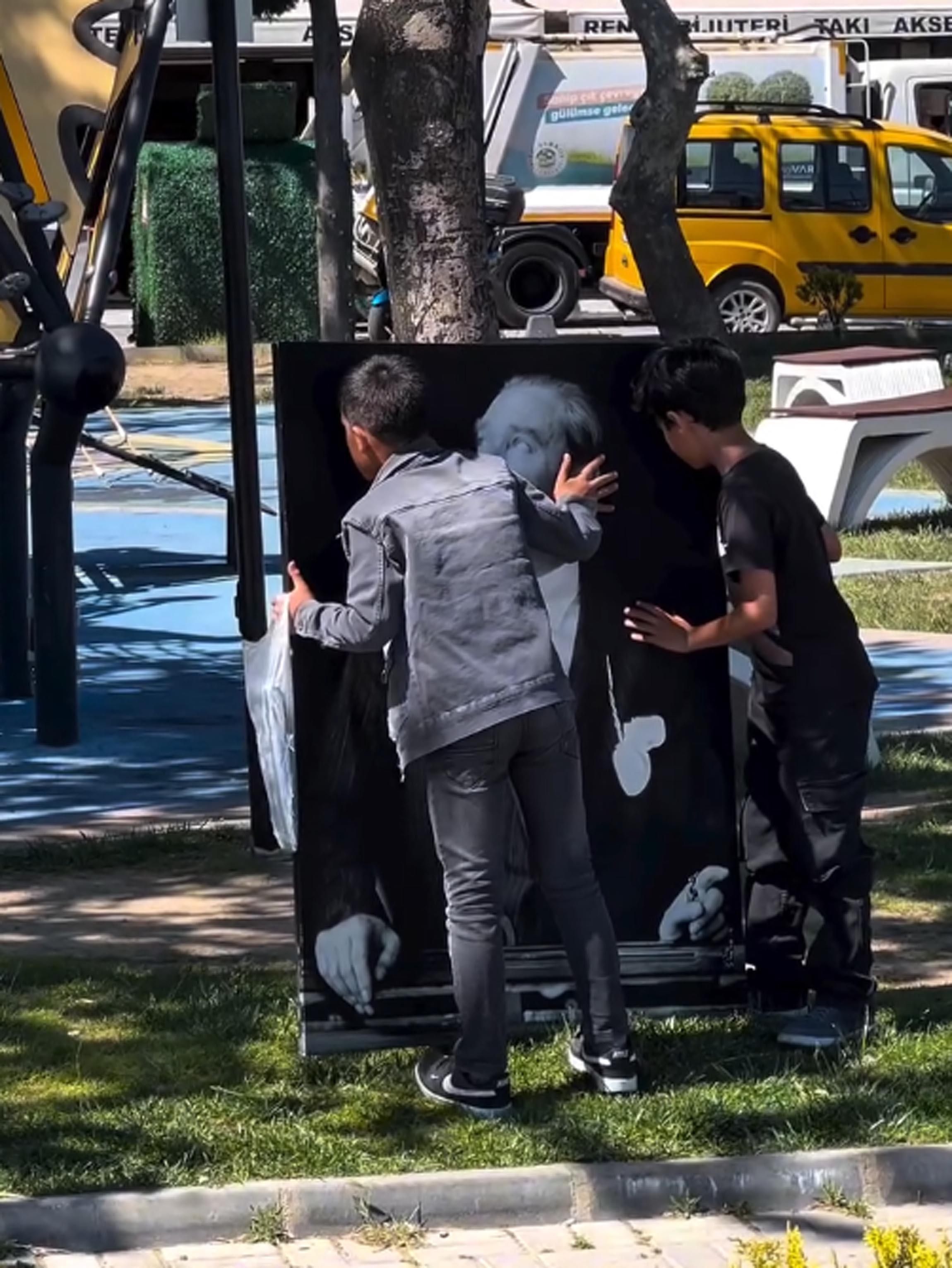 İKİ ÇOCUK ATATÜRK PORTRESİNİ DÜZELTTİKTEN SONRA ÖPTÜ