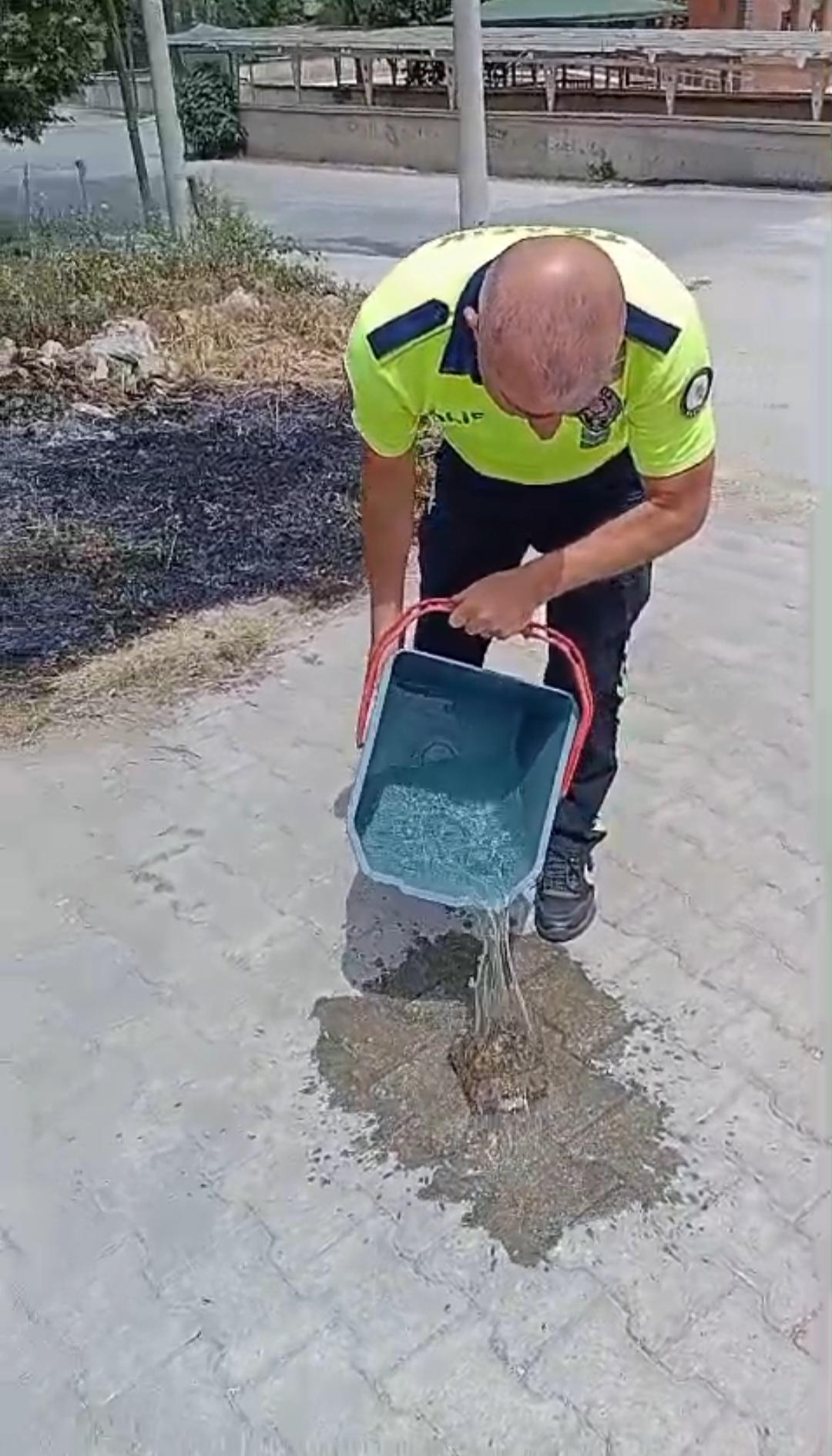 İbrahim UĞUR/ERBAA(Tokat), (DHA)-TOKAT'ın Erbaa ilçesinde uygulama yapan polisler, yanan otların arasında kalan kaplumbağayı kurtardı.