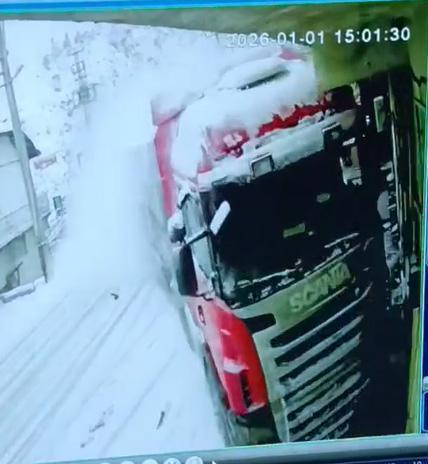 Fatih YILMAZ/ TOKAT, (DHA)- TOKAT'ın Reşadiye ilçesinde, sürücüsünün kontrolünden çıkan TIR'ın bir eve çarpma anı güvenlik kamerasına yansıdı.