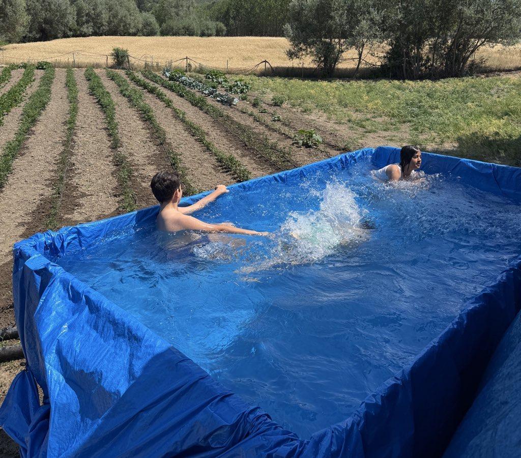 Fatih YILMAZ/ TOKAT, (DHA)- TOKAT’ta Mustafa Varol (64), sıcaktan bunalan torunları için traktör römorkunu havuza çevirerek serinlemelerini sağladı.