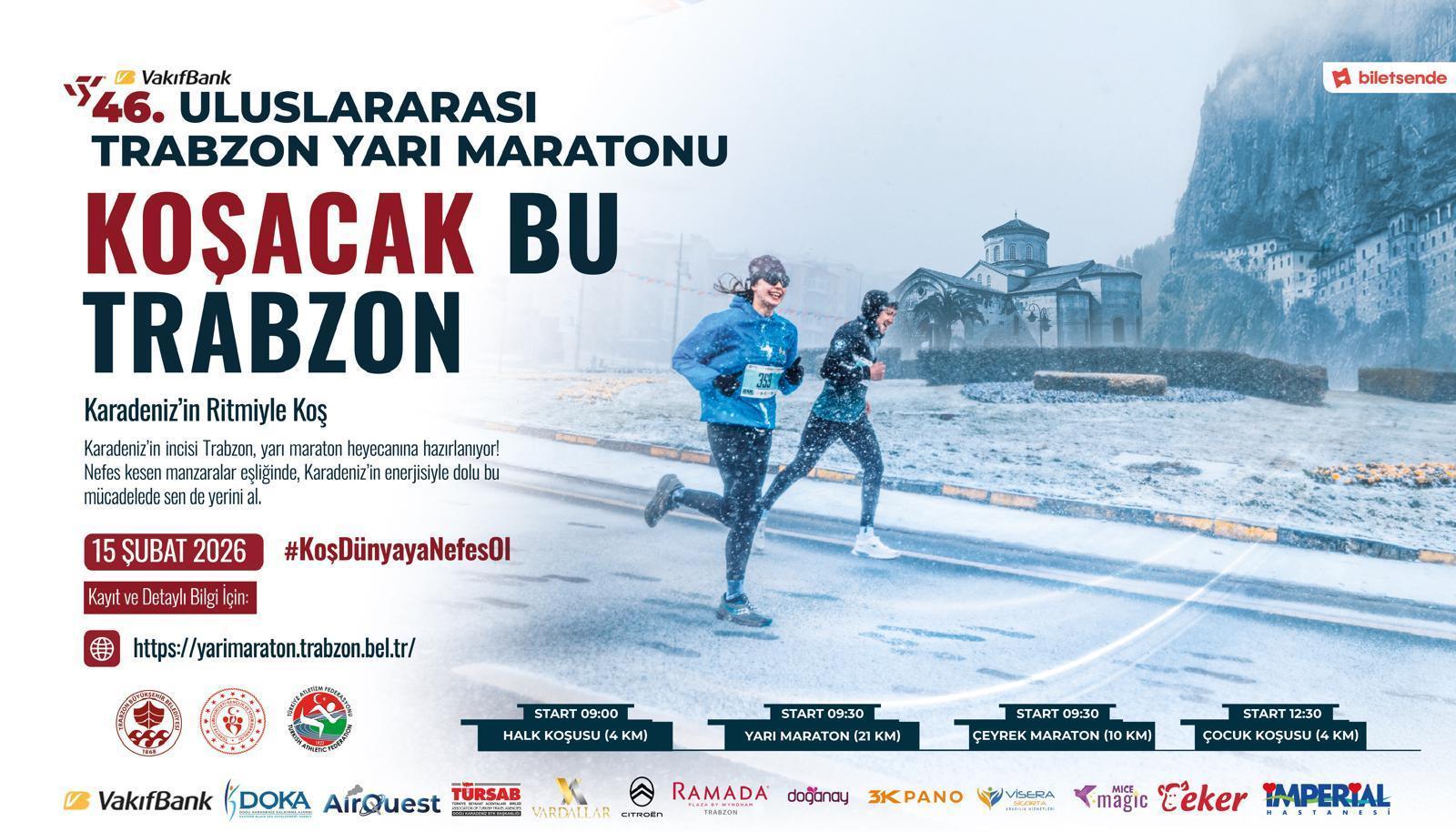 Trabzon’un düşman işgalinden kurtuluşunun 108'inci yıl dönümü dolayısıyla bu yıl ‘Koş Dünyaya Nefes Ol' sloganıyla düzenlenecek olan VakıfBank 46'ncı Uluslararası Trabzon Yarı Maratonu, 15 Şubat 2026 Pazar günü gerçekleştirilecek. Trabzon Büyükşehir Belediyesi’nin spor turizmini canlandırma ve kenti uluslararası arenada daha görünür kılma hedefiyle hayata geçirdiği yarı maraton, bu yıl da yoğun ilgi görüyor. Organizasyona, aralarında elit sporcuların da bulunduğu 40 farklı ülkeden profesyonel atletlerin katılması beklenirken, şu ana kadar yaklaşık 3 bin kişi kayıt yaptırdı.