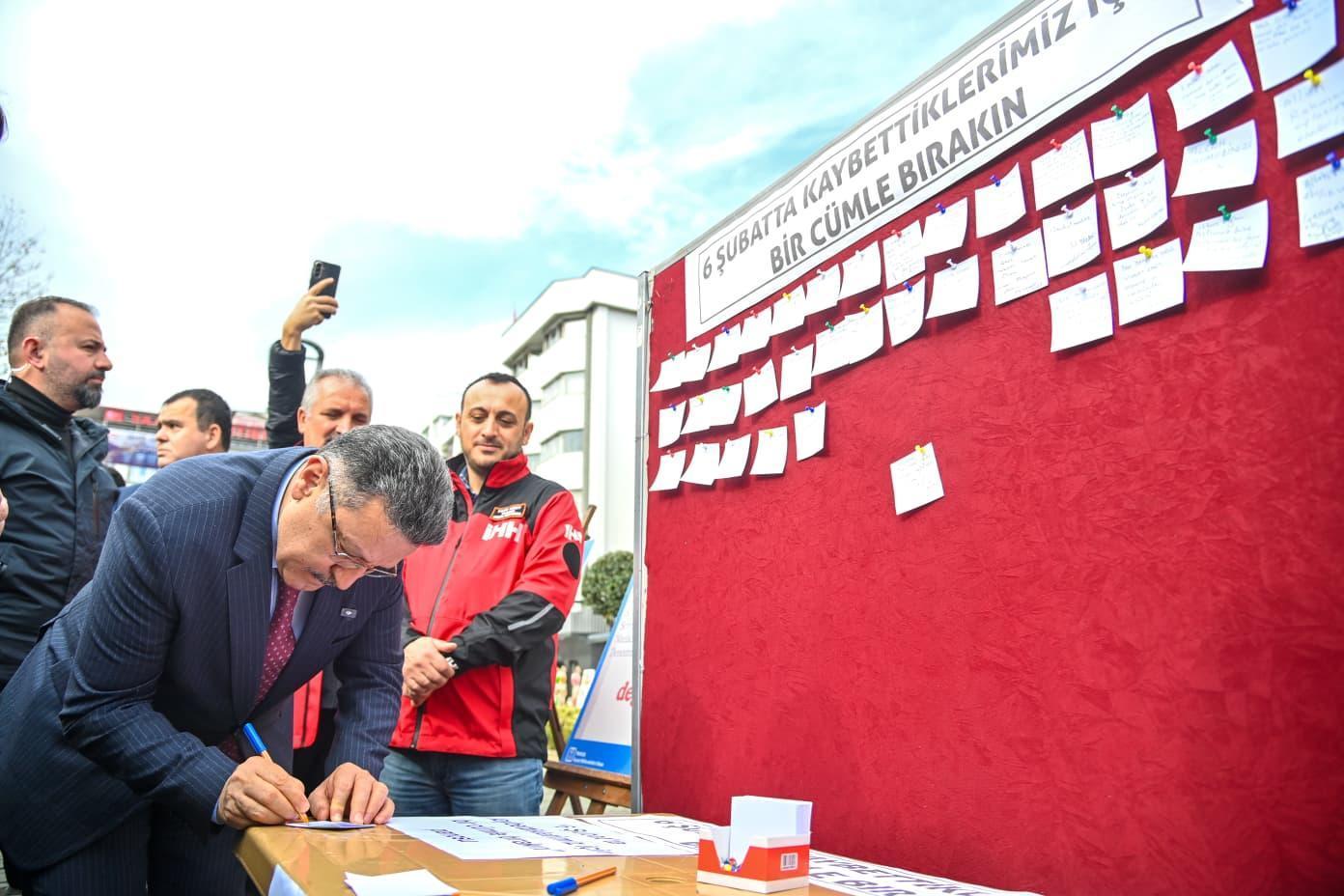 Katılımcılar, depremde ölenleri anmak için alanda kurulan '6 Şubat'ta kaybettiklerimiz için bir cümle bırakın' başlıklı panoya, duygularını yazdıkları not kağıtları yapıştırdı. (DHA)