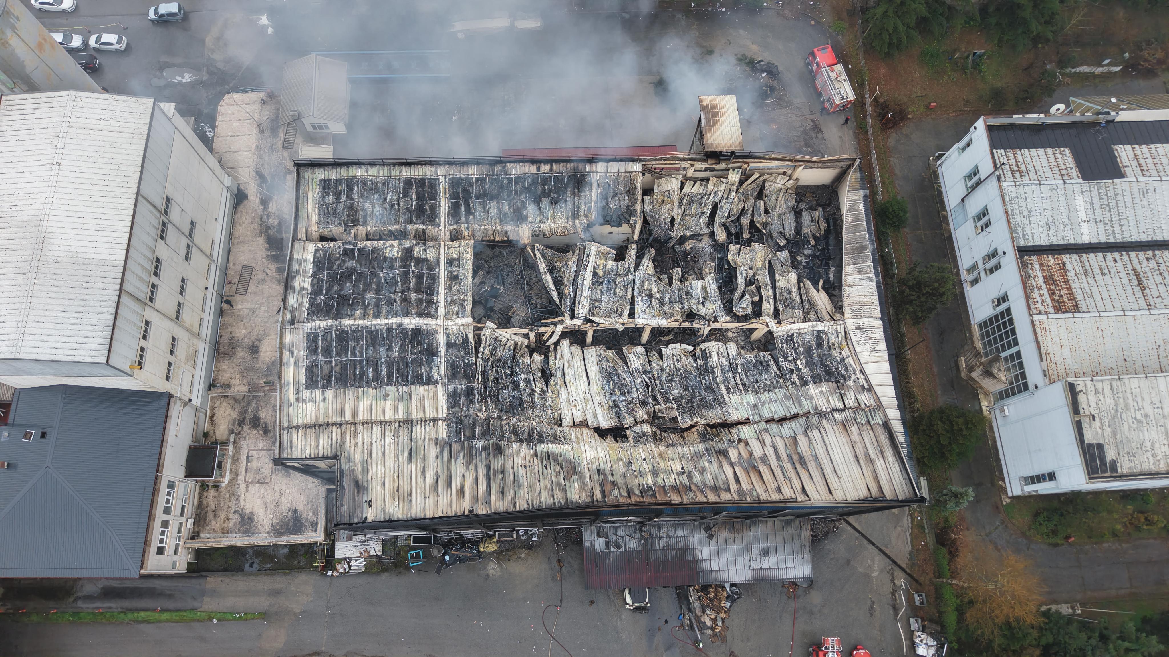 Öte yandan, çıkan yangının verdiği hasar, gün aydınlanınca ortaya çıktı. Dronla görüntülenen ve çatısı çöken fabrikanın büyük bölümünün tamamen kullanılmaz hale geldiği görüldü.