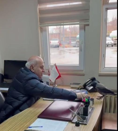 Belediye başkanı, odasına giren kargayı besledi