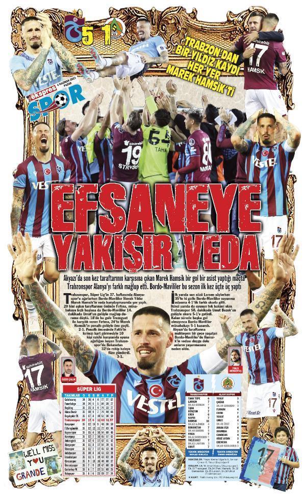 Selay SAYKAL/TRABZON,(DHA)- Trabzonspor’un 5-1’lik Corendon Alanyaspor galibiyeti taraftarın yüzünü güldürürken, yıldız oyuncu Marek Hamsik’in Akyazı’daki son maçına çıkması da camiayı hüzne boğdu. Futbol kariyerini sonlandırma kararı alan Slovak oyuncu, bordo mavili formayla evindeki son dansını gözyaşlarıyla yaptı. Hamsik’in duygu dolu vedası gazete manşetlerinde yer aldı.