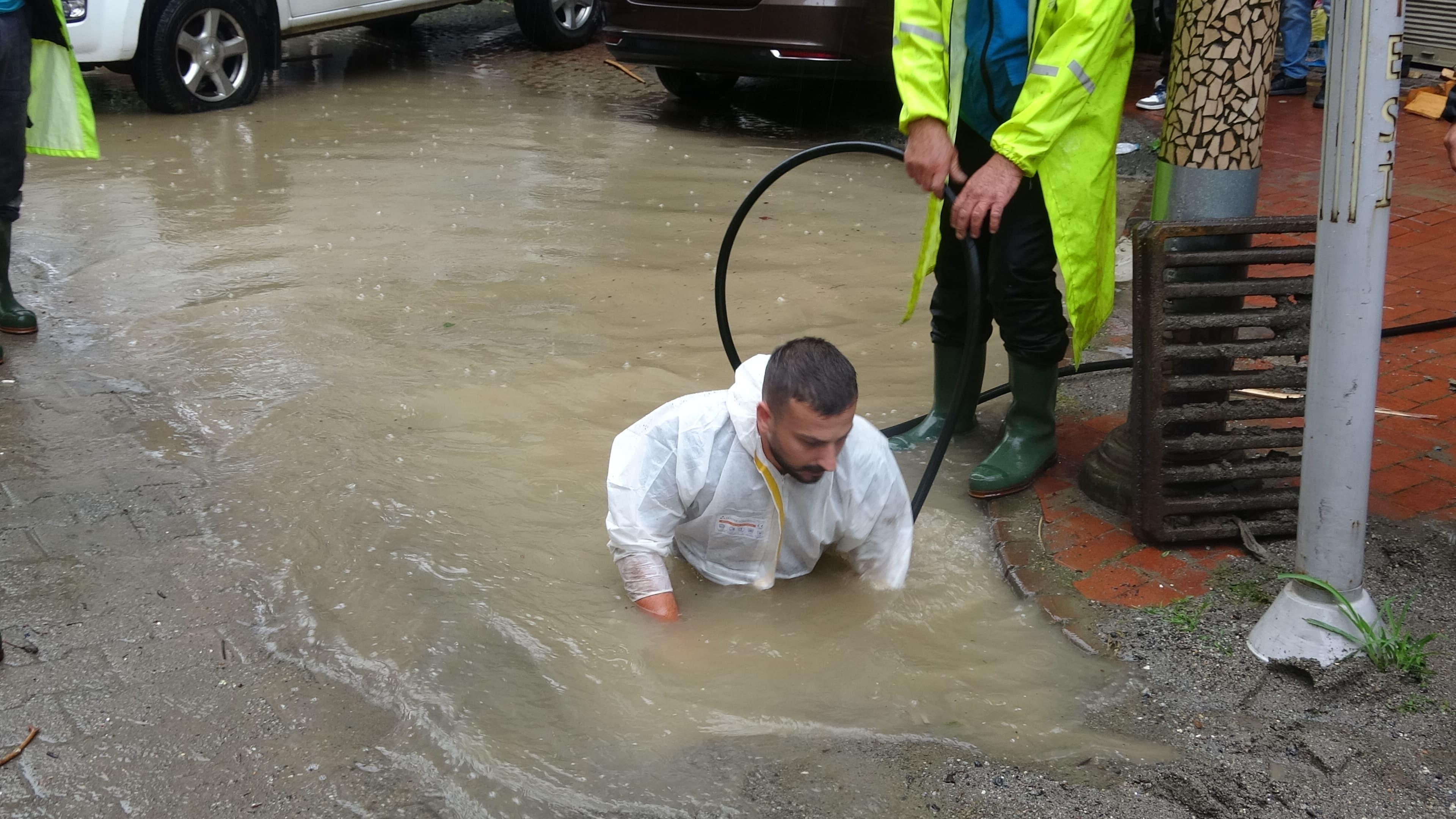 Salim SARIKOÇ/ SÜRMENE(Trabzon), (DHA)- TRABZON’un Sürmene ilçesinde etkili olan sağanak yağışın ardından cadde ve sokaklarda su taşkınları meydana geldi. Yağış nedeniyle kapanan kanalizasyon kanalları, belediye ekiplerinin müdahalesiyle açıldı.