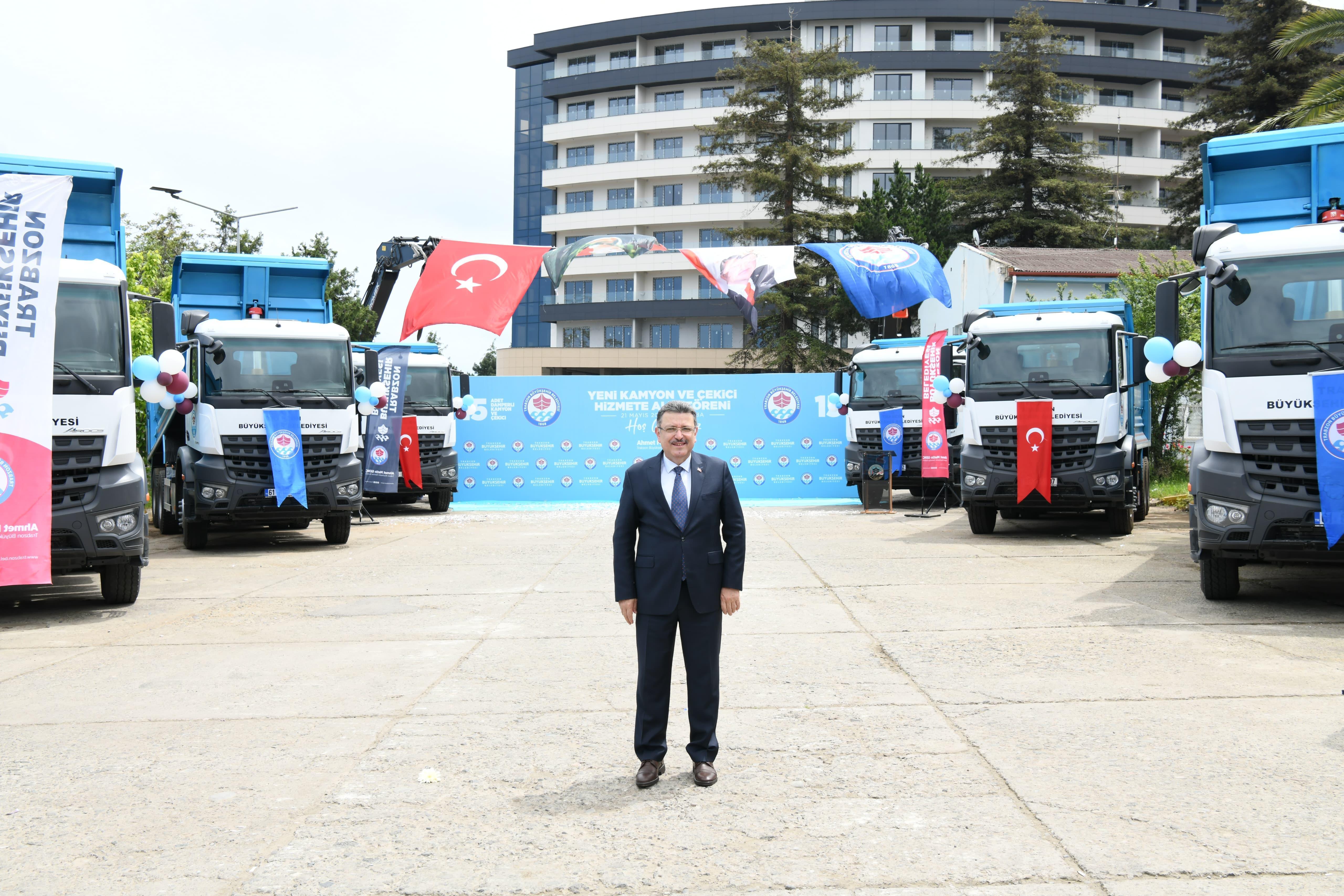 TRABZON,(DHA)- TRABZON Büyükşehir Belediyesi filosuna kazandırılan 13 kamyon ve 2 çekici TIR, Büyükşehir Belediye Başkanı Ahmet Metin Genç’in katıldığı törenle hizmete alındı. Başkan Genç, makine parkını yenilemeyi ve araç filosunu güçlendirmeyi sürdürdüklerini belirterek “Dışarıdan hizmet alımına ihtiyaç duymadan bütün ilçelerimize kendi imkanlarımızla hizmet edecek duruma geleceğiz” dedi.