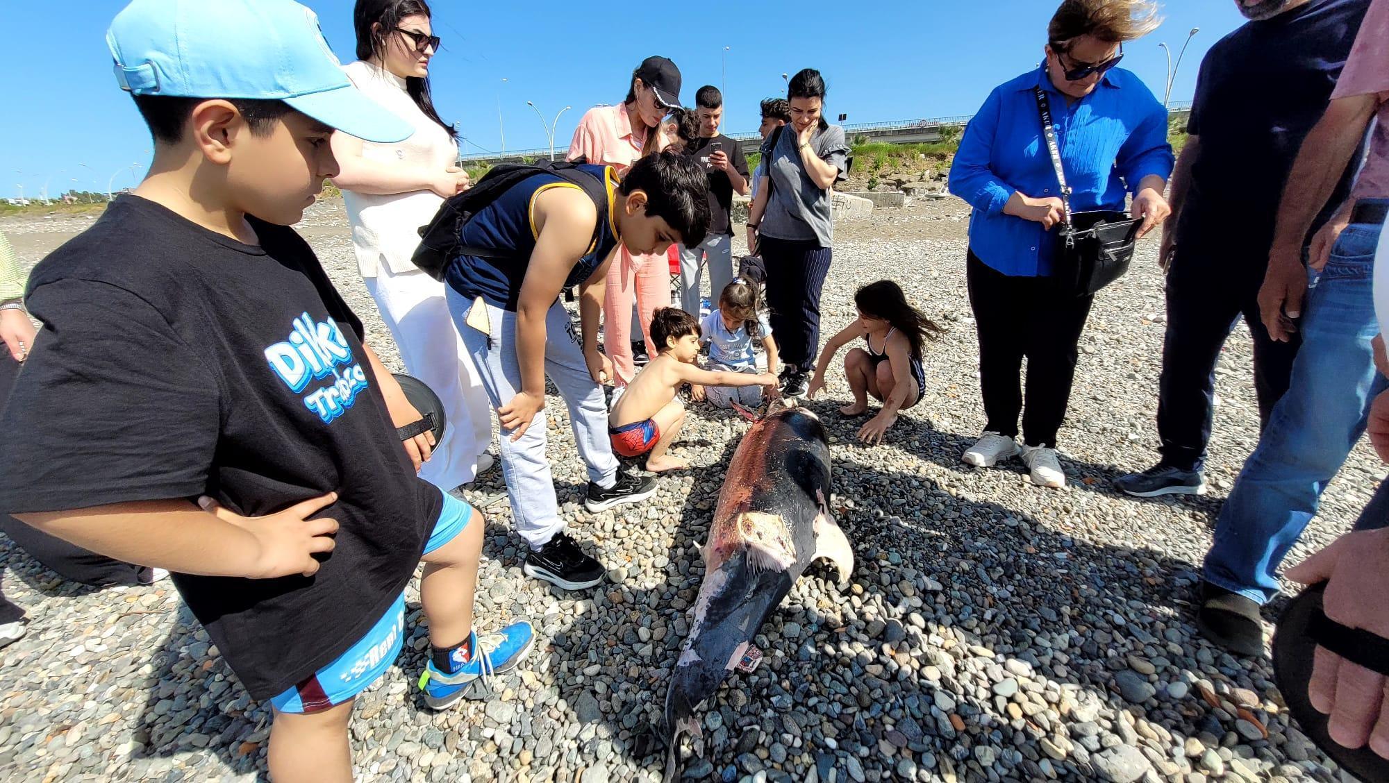 Selçuk BAŞAR-Efnan DEMİREREN/TRABZON, (DHA)- TRABZON'un Ortahisar ilçesinde ölü yunus, sahile vurdu. Sahilde kumla oynayan çocuklar, ölü yunusu meraklı gözlerle izledi.