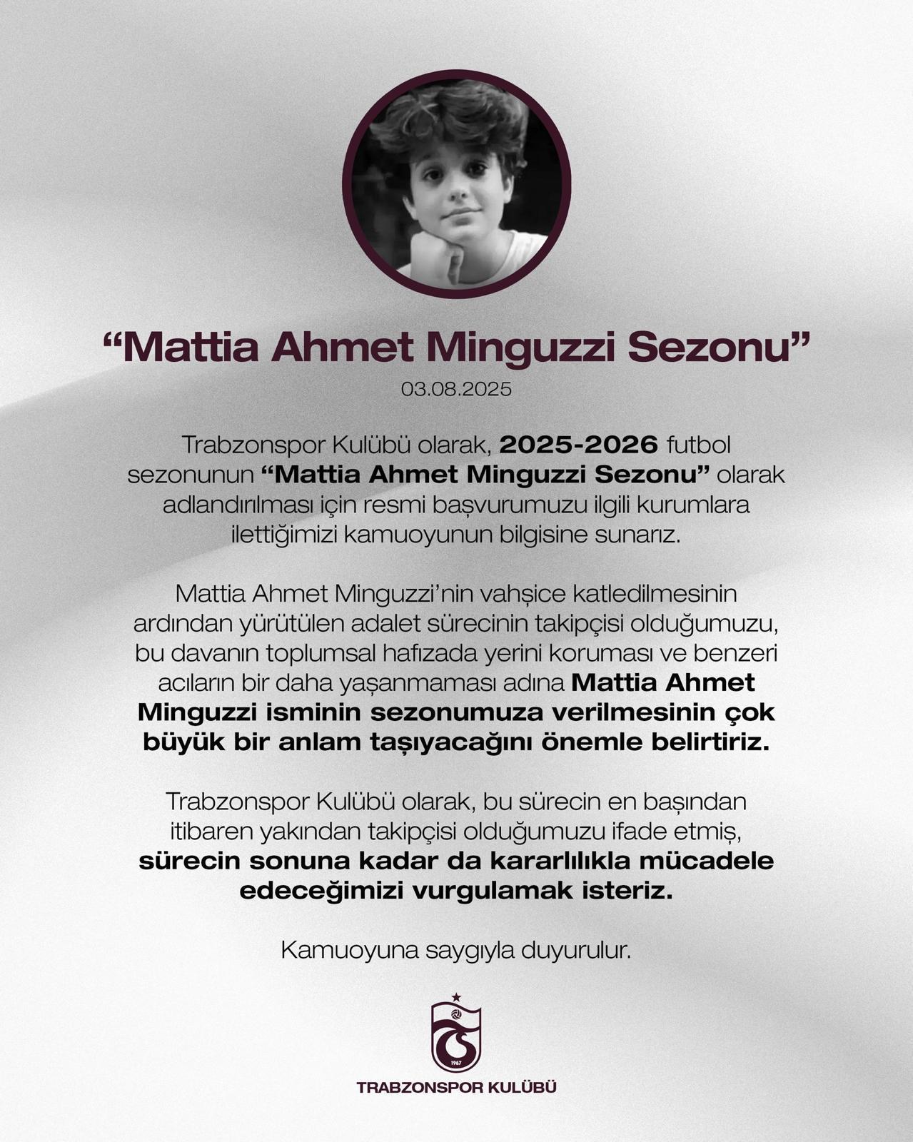 Kulüpten yapılan açıklamada, İstanbul Kadıköy'de bıçaklanarak öldürülen Mattia Ahmet Minguzzi'nin (15) isminin 2025-2026 sezonuna verilmesinin, adalet sürecinin toplumsal hafızada yerini koruması açısından büyük önem taşıdığı belirtildi. Açıklamada, “Trabzonspor Kulübü olarak, 2025-2026 futbol sezonunun “Mattia Ahmet Minguzzi Sezonu” olarak adlandırılması için resmi başvurumuzu ilgili kurumlara ilettiğimizi kamuoyunun bilgisine sunarız. Mattia Ahmet Minguzzi’nin vahşice katledilmesinin ardından yürütülen adalet sürecinin takipçisi olduğumuzu, bu davanın toplumsal hafızada yerini koruması ve benzeri acıların bir daha yaşanmaması adına Mattia Ahmet Minguzzi isminin sezonumuza verilmesinin çok büyük bir anlam taşıyacağını önemle belirtiriz. Trabzonspor Kulübü olarak, bu sürecin en başından itibaren yakından takipçisi olduğumuzu ifade etmiş, sürecin sonuna kadar da kararlılıkla mücadele edeceğimizi vurgulamak isteriz” denildi.
