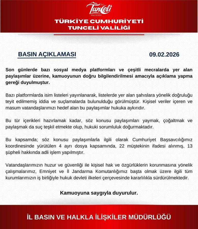 Tunceli Valiliği, son günlerde bazı sosyal medya platformları ve çeşitli mecralarda yer alan paylaşımlar üzerine, açıklama yaptı. Açıklamada, bazı platformlarda isim listeleri yayımlanarak, listelerde yer alan kişilere yönelik doğruluğu teyit edilmemiş iddia ve suçlamalarda bulunulduğu belirtildi.