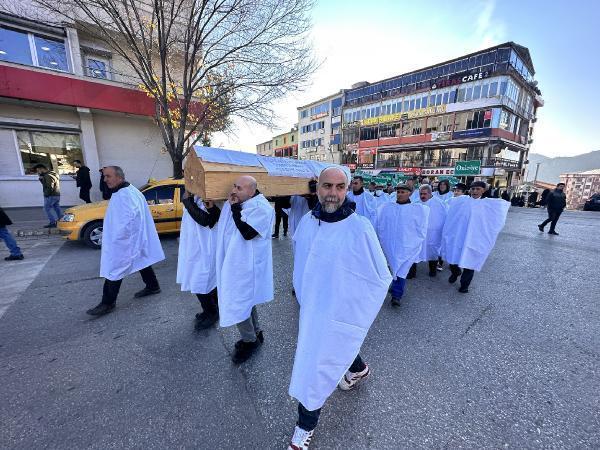 Serhat Ozan YILDIRIM/TUNCELİ, (DHA)- TUNCELİ'de köylerine yapılacak 'Entegre Katı Atık Bertaraf Tesisi' projesiyle 55 bin ağaç kesileceğini, doğanın tahrip edileceğini belirten köylüler, tesisle ilgili toplantı öncesi kefen giyip, taşıdıkları tabutla Tunceli Belediyesi önüne gelerek protesto gösterisi yaptı.