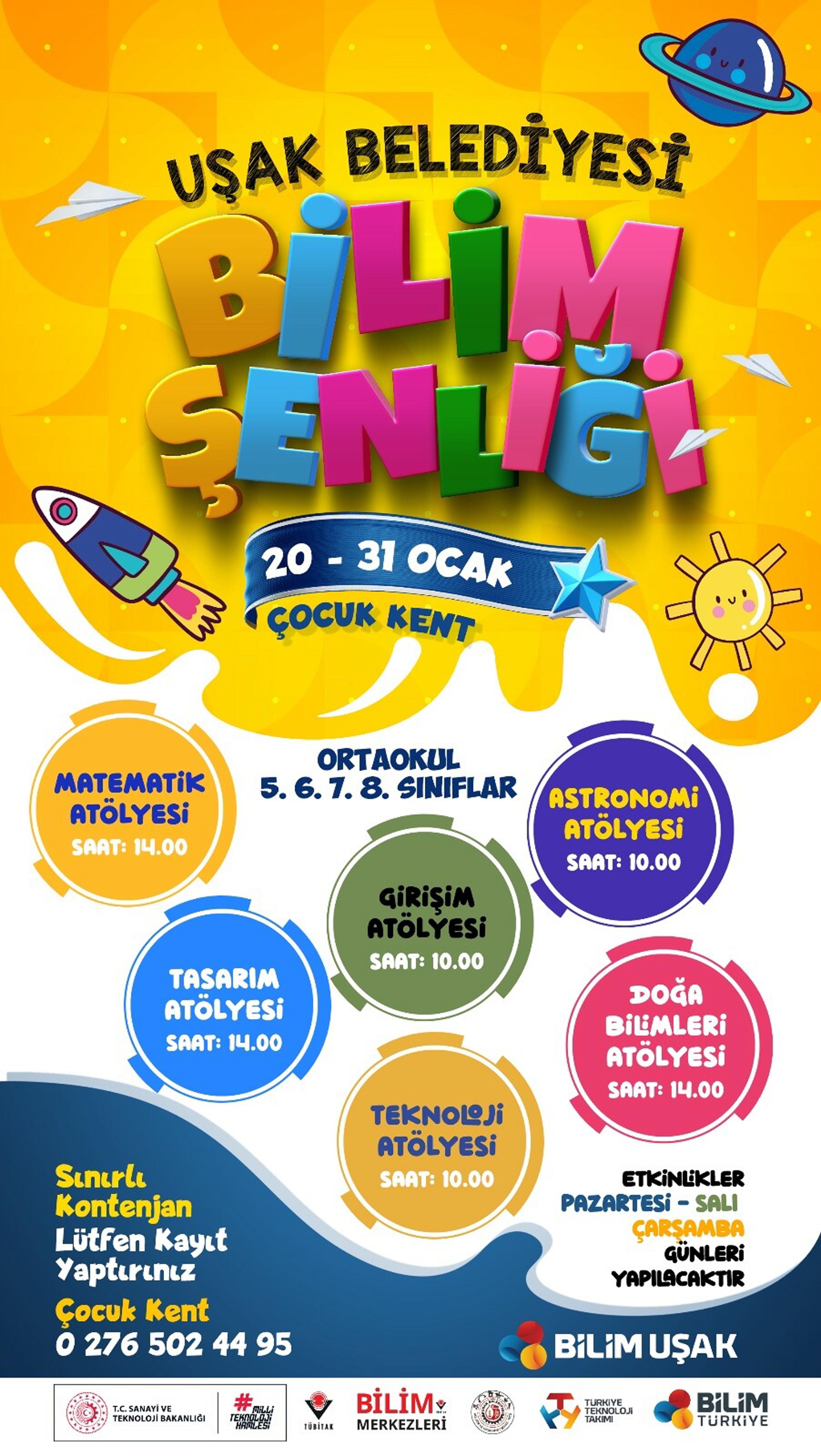Öte yandan Uşak Belediyesi ile Tübitak ve T3 Vakfı paydaşlığında bu yıl başlatılan Bilim Uşak Şenliği; Çocuk Kent'te açılacak atölyeleriyle bu sömestrde çocuklara eğlenceli ve keşif dolu zamanlar yaşatacak. 20 -31 Ocak 2025 tarihleri arasında Çocuk Kent'e gidecek öğrenciler ve aileleri, Doğa Bilimleri Atölyesi, Matematik Atölyesi, Girişimcilik Atölyesi, Tasarım Atölyesi, Teknoloji Atölyesi ve Uzay Havacılık Astronomi Atölyesi gibi 6 farklı atölyeye katılma fırsatı bulacak. Birbirinden eğlenceli ve öğretici atölye çalışmalarına ortaokul seviyesindeki 5, 6, 7 ve 8. sınıfa giden öğrenciler katılabilecek. Sömestr tatilini bilimsel çalışmalar ile değerlendirmek isteyen öğrenciler, sınırlı sayıdaki kontenjanı kaçırmamak adına 0276 502 44 95 numaralı telefondan iletişime geçerek ya da Çocuk Kent'teki Bilim Uşak atölyelerine şahsen giderek başvuruda bulunabilecek. (DHA)