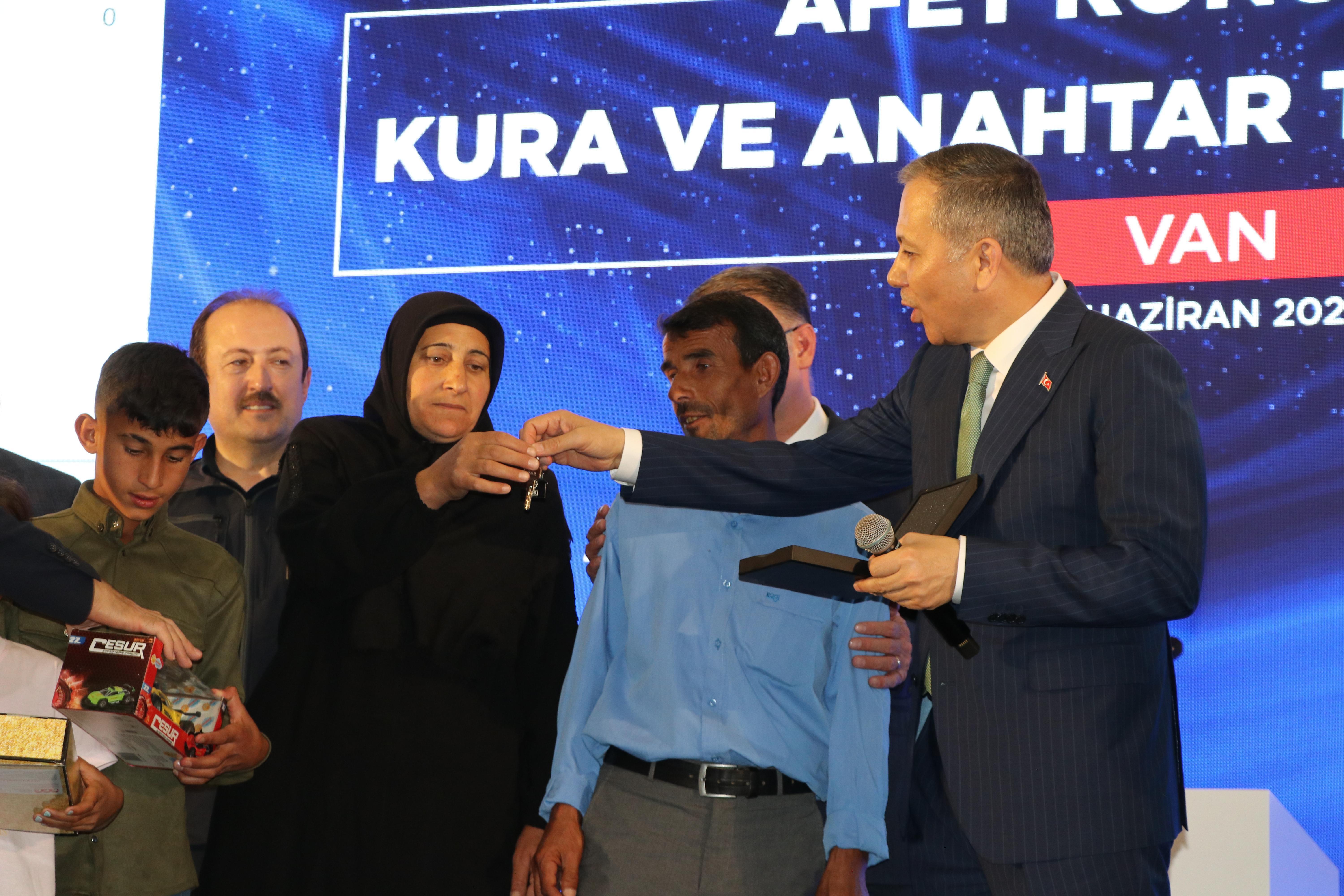 Van'da yapımı tamamlanan 337 afet konutunun kura çekimi ile 32 konutun hak sahiplerine anahtar teslim törenine katılmak üzere kente gelen İçişleri Bakanı Yerlikaya, Van Valisi ve Belediye Başkan Vekili Ozan Balcı tarafından karşılandı. Konutların anahtar teslim töreni, merkez Edremit ilçesinde bulunan uygulama otelinde düzenlendi. Törene Bakan Yerlikaya, Bakan Yardımcısı Münir Karaloğlu, Afet ve Acil Durum Yönetimi (AFAD) Başkanı Ali Hamza Pehlivan, Van Valisi ve Büyükşehir Belediyesi Başkan Vekili Ozan Balcı, Jandarma Asayiş Kolordu Komutanı Tümgeneral Ünsal Bulut, İl Emniyet Müdürü Murat Mutlu, AK Parti Van İl Başkanı Abdulahat Arvas, ilçe kaymakamları ve kura katılan hak sahipleri katıldı.