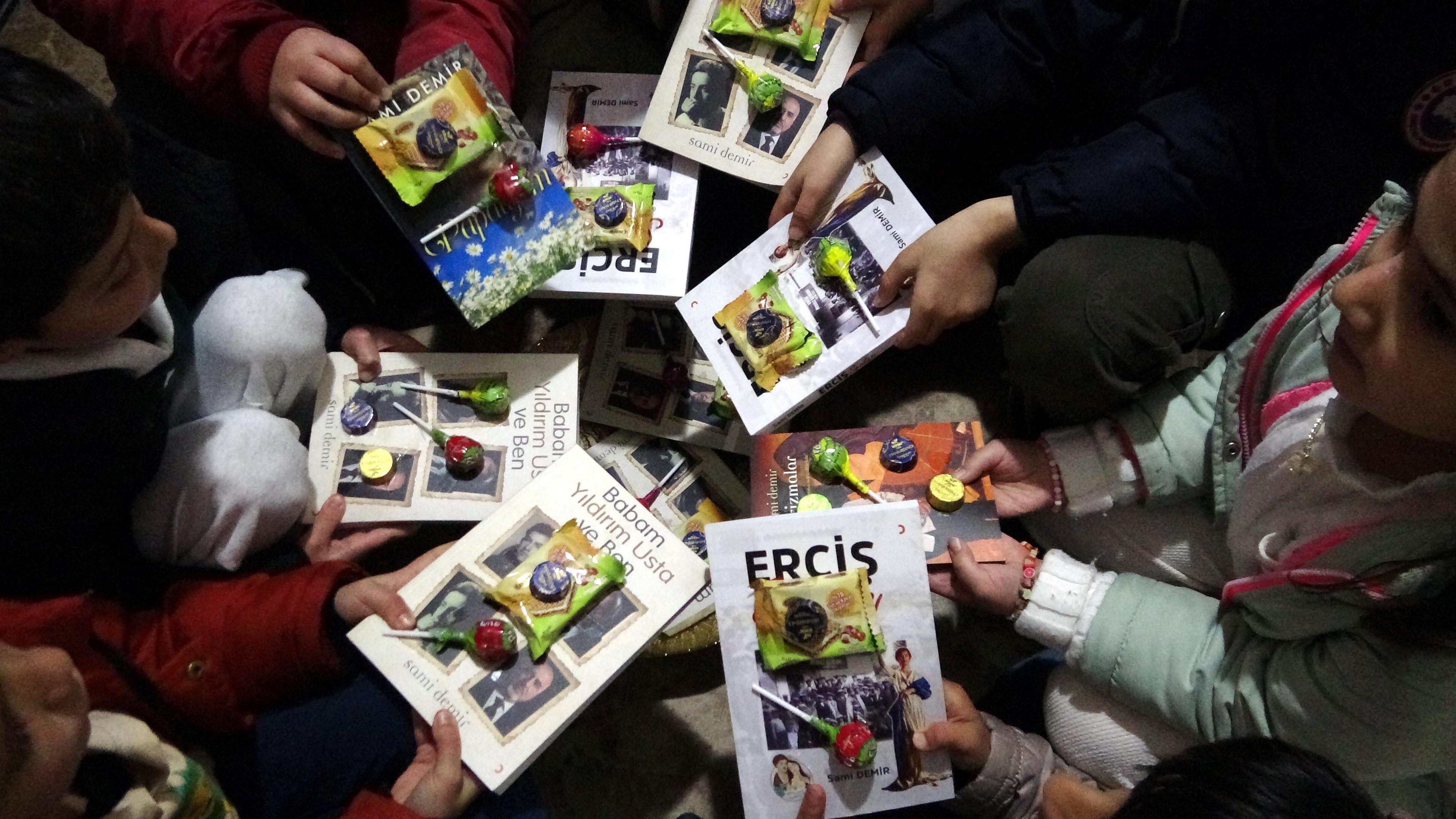 Barış KUL/ERCİŞ, (Van), (DHA)- VAN’ın Erciş ilçesinde yaşayan Sami Demir (66), Ramazan Bayramı’nda kapısını çalan çocuklara sürpriz yaptı. Demir, bayram şekeri yerine kendi yazdığı kitapların üzerine yapıştırdığı şeker ve çikolataları çocuklara dağıtarak, kitap okuma alışkanlığının da önemine dikkat çekti.