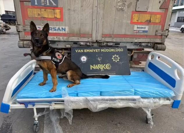 Gülay KUYUCU/VAN, (DHA)- VAN'da polis ekiplerinin, narkotik köpeği 'Thor' ile arama yaptığı TIR'da, sedye içine gizlenmiş 5 kilo 480 gram metamfetamin ele geçirildi, 4 şüpheli gözaltına alındı.
