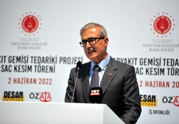 "Bugün Deniz Kuvvetleri Komutanlığımız ve Sahil Güvenlik Komutanlığımıza bağlı yüzer unsurlar ile dost ve müttefik unsurların lojistik ihtiyaçlarının karşılanması amacıyla, manevra gücü yüksek, limanda, bekleme mevkilerinde akaryakıt ikmali yapabilecek kabiliyete sahip akaryakıt gemilerimizin sac kesim töreni için bir araya geldik. İnşallah bu projeyle, mavi vatanda hizmet eden güvenlik güçlerimizin önemli bir ihtiyacını daha karşılamış olacağız. İnsansız sistemlerde yakaladığımız başarıyı, insanlı sistemlerle birlikte entegre ederek geleceğin harekat ortamında çok daha güçlü ve var olmayı amaç edindik. Ülkemize karşı uygulanan gizli, açık ambargolar ve benzeri kısıtlamalar gösteriyor ki, savuma sanayimizin hiçbir alanında özellikle stratejik ürünlerde dışa bağımlı olmayı sürdüremeyiz, bağımlı kalamayız. O yüzden bunu kendimize şiar edindik. Karada, denizde, havada, deniz altında, uzayda, ülkemiz stratejik teknolojileri geliştirmek, burada mutlak bağımsızlığını sağlamak zorundadır."