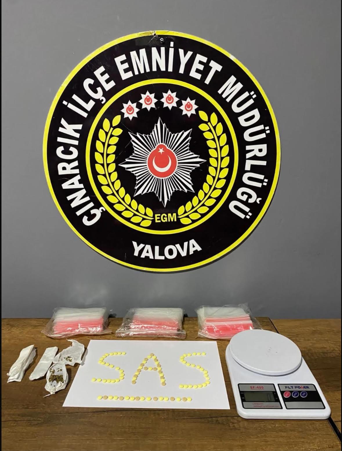 Çınarcık İlçe Emniyet Müdürlüğü ekipleri, ilçede uyuşturucu ticareti yapıldığı ihbarı üzerine harekete geçti. Ekipler uyuşturucu madde ticareti yaptığını tespit ettiği B.B.'yi teknik ve fiziki takibe aldı. Şüpheli, adresine düzenlenen baskınla yakalanırken, evde yapılan aramalarda, mutfak tipi hassas terazi, çok sayıda kilitli şeffaf naylon poşet, uyuşturucu madde olduğu değerlendirilen 0.33 gram ağırlığında yeşil bitki parçaları, toplam 83 adet uyuşturucu hap ele geçirildi. Gözaltına alınan B.B., emniyetteki işlemlerinin ardından sevk edildiği adliyede çıkarıldığı mahkemece tutuklanarak cezaevine gönderildi. (DHA)