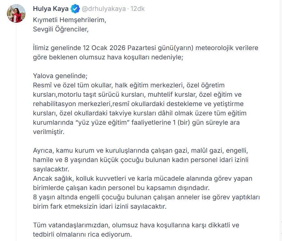 Yalova Valiliği meteorolojik verilere göre beklenen olumsuz hava koşulları nedeniyle eğitim ve öğretime bir gün süreyle ara verildiğini açıkladı. Yalova Valisi Hülya Kaya, sanal medya hesabından yaptığı paylaşımda, "Yalova genelinde; resmi ve özel tüm okullar, halk eğitim merkezleri, özel öğretim kursları, motorlu taşıt sürücü kursları, muhtelif kurslar, özel eğitim ve rehabilitasyon merkezleri, resmi okullardaki destekleme ve yetiştirme kursları, özel okullardaki takviye kursları dahil olmak üzere tüm eğitim kurumlarında yüz yüze eğitim faaliyetlerine 1 gün süreyle ara verilmiştir. Ayrıca, kamu kurum ve kuruluşlarında çalışan gazi, malül gazi, engelli, hamile ve 8 yaşından küçük çocuğu bulunan kadın personel idari izinli sayılacaktır. Ancak sağlık, kolluk kuvvetleri ve karla mücadele alanında görev yapan birimlerde çalışan kadın personel bu kapsamın dışındadır. 8 yaşın altında engelli çocuğu bulunan çalışan anneler ise görev yaptıkları birim fark etmeksizin idari izinli sayılacaktır. Tüm vatandaşlarımızdan, olumsuz hava koşullarına karşı dikkatli ve tedbirli olmalarını rica ediyorum” ifadeleri kullanıldı. (DHA)