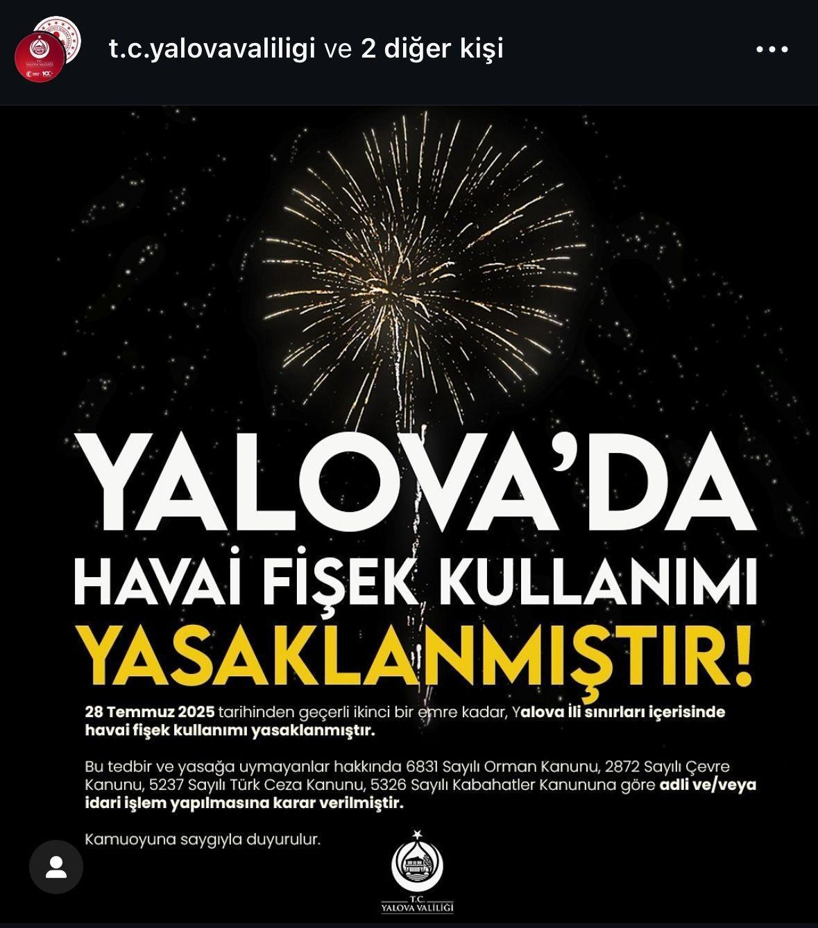 Yalova İli Orman Yangınlarını Önleme ve Mücadele Komisyonu’nca alınan karara göre 28 Temmuz tarihinden başlayarak, Yalova il sınırları içinde havai fişek kullanımına ikinci bir emre kadar yasak getirildi. Yalova Valiliğinin sosyal medya hesabından yapılan açıklamada, “28 Temmuz tarihinden geçerli 2’nci bir emre kadar, Yalova il sınırları içinde havai fişek kullanımı yasaklanmıştır. Bu tedbir ve yasağa uymayanlar hakkında 6831 Sayılı Orman Kanunu, 2872 Sayılı Çevre Kanunu, 5237 Sayılı Türk Ceza Kanunu ve 5326 Sayılı Kabahatler Kanunu kapsamında adli ve/veya idari işlem yapılacaktır” ifadelerine yer verildi. (DHA)