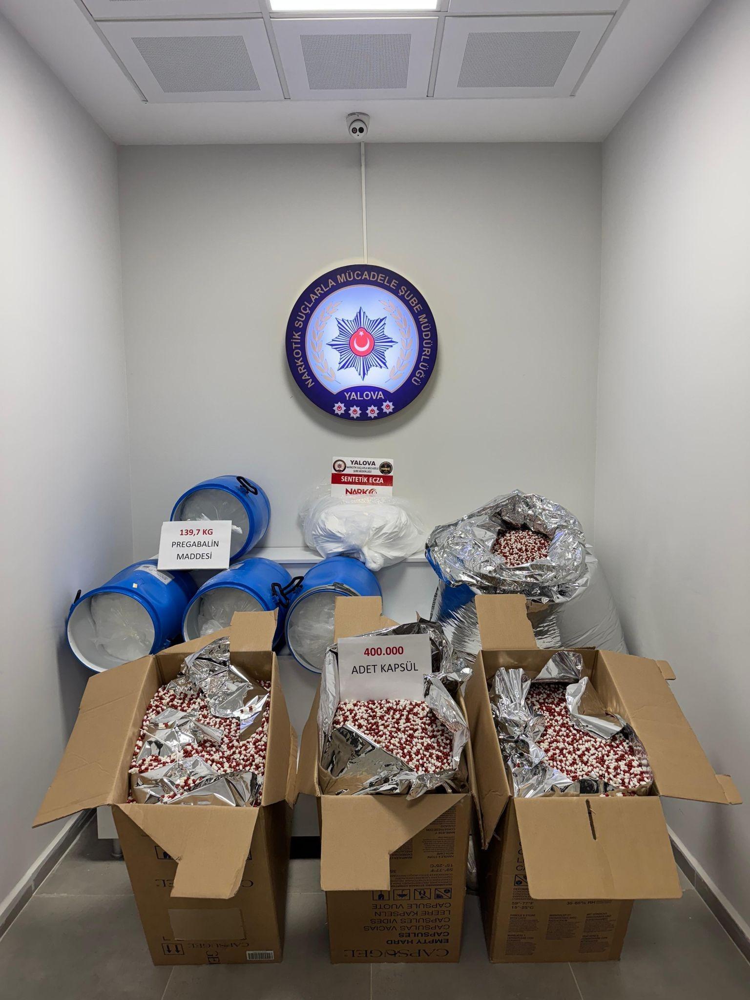 Yalova'da 140 kilo pregabalin maddesi ile doluma hazır 400 bin sentetik ecza kapsülü ele geçirildi; 3 tutuklama