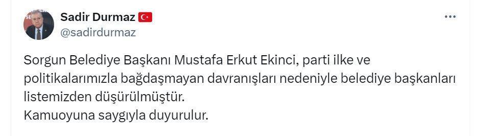 MHP'li Durmaz, sosyal medya hesabından yaptığı açıklamada, "Sorgun Belediye Başkanı Mustafa Erkut Ekinci, parti ilke ve politikalarımızla bağdaşmayan davranışları nedeniyle belediye başkanları listemizden düşürülmüştür" ifadelerini kullandı.