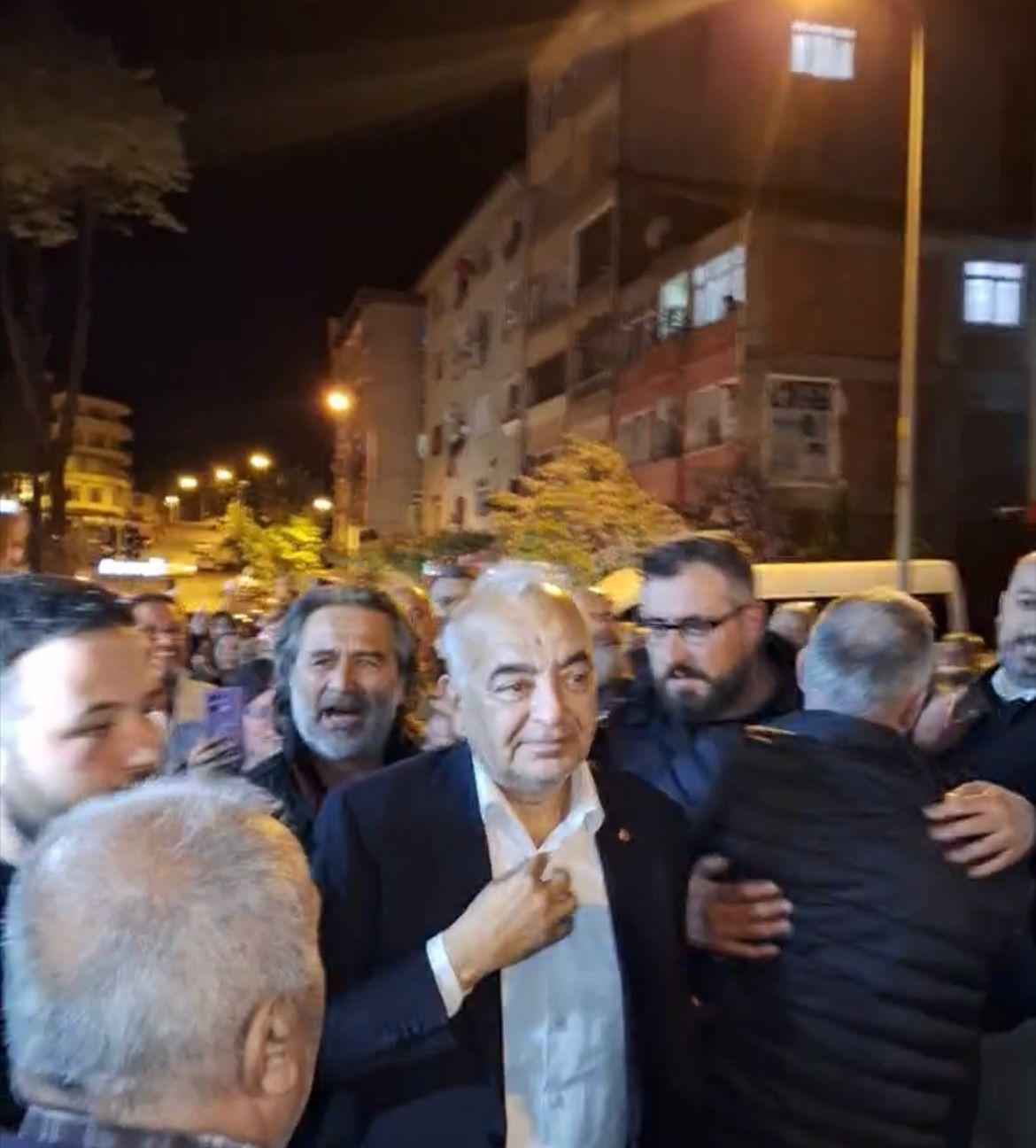 Ev hapsi kararıyla serbest kalan eski başkan Bozkurt’u, adliye önünde bekleyen bir grup, alkışlarla karşılayarak 'Hepimiz Çetin'iz', 'Çetin Başkan' diye slogan attı. (DHA)
