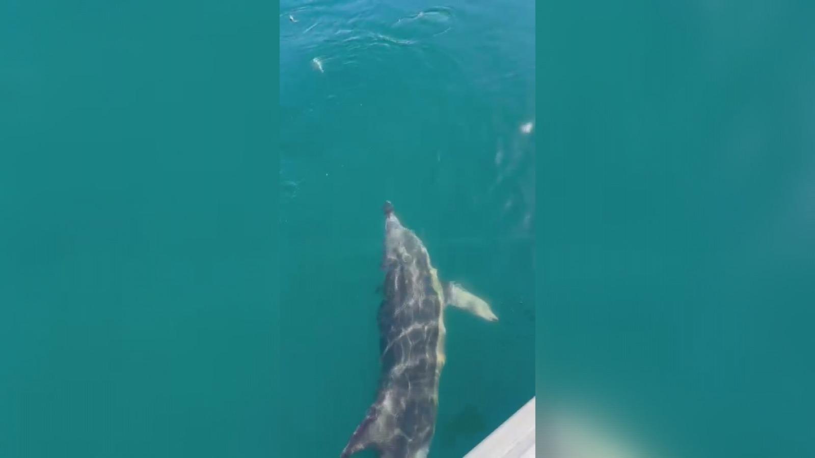 Balıkçılar oltadaki balık ile yunusu etraflarında yüzdürdü; o anlar kamerada